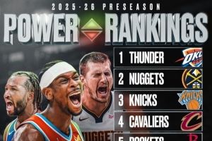 体育资讯10月8日讯 美媒Basketball Forever在赛季正式开打之前评选出的季前球队实力榜TOP10。其中雷霆排在第一,掘金第二,尼克斯排在第三。