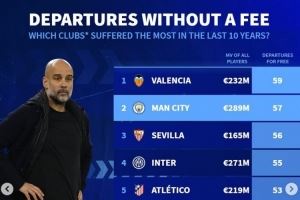 体育资讯7月10日讯 《转会市场》统计了近10年来五大联赛俱乐部的免签离队情况,瓦伦西亚59人最多。