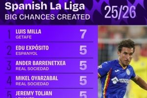 体育资讯10月7日讯 日前,Squawka统计了本赛季西甲创造进球机会次数排行,拉菲尼亚、居勒尔4次并列第六。