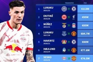 7、塞斯科(2025-26赛季RB莱比锡→曼联),7650万欧元